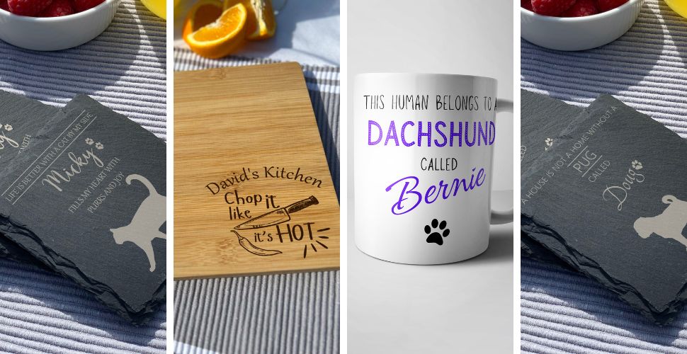 Explore our bespoke range of personalized gifts, from beautifully engraved chopping boards to custom pet-themed coasters and mugs.