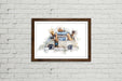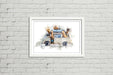 This contemporary watercolour print captures a poised gathering of camels in a clean, balanced composition. The warm tones and generous white space create a calm yet characterful statement piece, well suited to modern living rooms, offices or minimalist interiors.